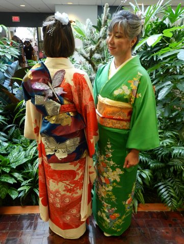 This year my younger daughter and I were honored to be models in the very popular kimono show, put on by a certified kimono expert with ten years of training in Japan. I looked so good I didn’t recognize myself, thanks to an elegant emerald kimono and the magic of a specialist hair stylist. My daughter was more beautiful than usual, wearing the long furisode sleeves of young, unmarried women. Women in Japan don’t wear kimono much anymore, and we could understand why! We were (barely) walking pillars, bound tightly by many narrow ties and our wide obi sash.