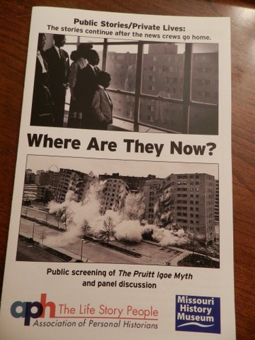 Pruitt-IgoeI love historical documentaries, partly because they usually include personal stories. The other day I saw The Pruitt-Igoe Myth, an independent film documenting the rise and fall of the infamous Pruitt-Igoe public housing project in downtown St. Louis. All I knew of the project was that it was a controversial symbol generally interpreted as either a failure of public housing or a failure of the poor (especially black poor) to behave civilly, or both. I learned so much from the film and the discussion after with the film producer, a representative of our local history museum, and several former inhabitants of the project. There’s a huge story there, about as huge as the project, which I did not know occupied 57 acres! Apparently the media had its own big failure then by neglecting to explain all the complexities and instead focusing on a simple, negative agenda that became known worldwide. Most of the photos that exist of the project are of it being destroyed.