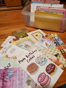 Next I will go through yearly appointment books starting with 1994, these beautifully illustrated with lovely art or nature photos. Will I be strong enough to throw these out? The early few years I want to save as they are full of memories of when we were moving around (including overseas)—where we traveled and who came to visit, kids activities and milestones, etc. I have decided to make a document where for each year I type up the important or interesting bits, like a timeline for remembrance sake, one that won’t fill up a big box. Of the illustrations, I will cut out my favorites and use them to collage greeting cards or paste them onto the fronts of greeting card envelopes.