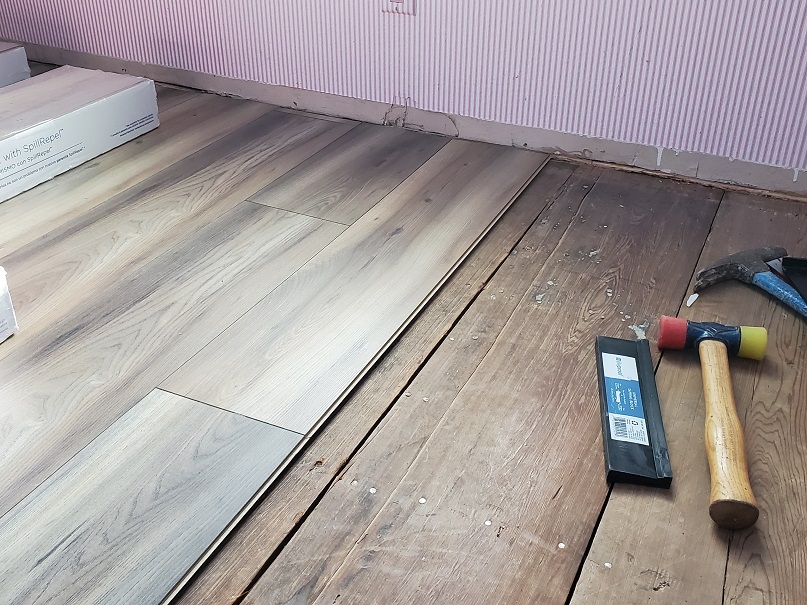 I’m pretty much done painting everything I see in the house, but I’m not going to rest yet. We had an unpleasant shock when finally trying to replace the old, kid-stained carpet upstairs—asbestos flooring underneath. Why put flooring up there that looks like it belongs in the kitchen? Guess the same people who thought pink tiles on bathroom walls and floors was stylin’. Yes, I had the tiny pink bathroom floor tiles, at least, replaced with larger tiles of a soothing color, and what a relief to behold. This is what happens when you have a 1940s home.