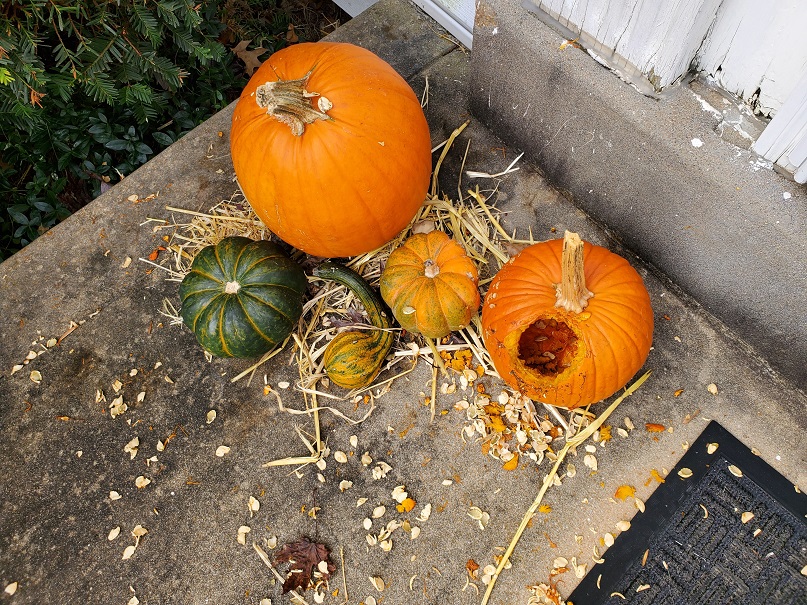 Naughty Squirrel Nutkin destroyed one of my pie pumpkins! I always buy two and brought the other in to safety. Because I MUST have fresh pumpkin pie for Thanksgiving! My sister clued me in to using fresh pumpkin puree a number of years ago and I cannot go back to using canned, and I especially do not want a storebought pie. The recipe she (now we) use does not have all those spices like the usual pies, which can be intense. This recipe only uses cinnamon, and the simple ingredients make for a lovely, light, custardy autumn pie with vanilla accent.