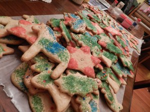 I’m copying my December 10, 2005, post here as WordPress is blocking it from views for some reason and someone recently asked for my eggnog butter cookie recipe. Things have changed for our family since 2005, but I still make these pretty cutout cookies with their mild nutmeg flavor. I discovered that the dough will freeze okay for future use, and the baked cookies will freeze okay, too, even with the sprinkles.