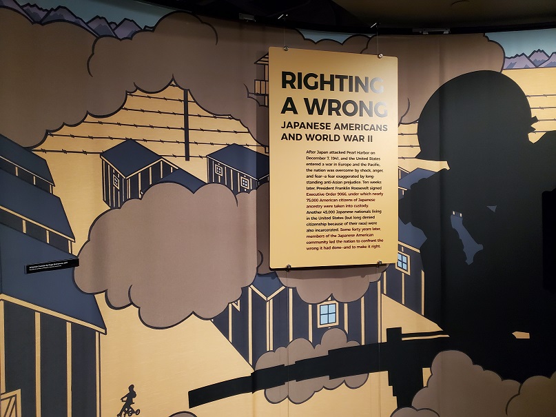 The traveling Smithsonian exhibit Righting a Wrong: Japanese Americans and WWII is here at our local Soldiers Memorial. I was aware of most of this information (after discovered this shocking episode in US history while researching for my mother’s WWII in Japan memoir), but only recently learned about Latin American Japanese sent to the US for internment. Seems some of the Latin American countries had the same attitudes about their Japanese-heritage residents as the Americans on our West Coast—deep prejudice and resentment of their successes despite discrimination. The US government gave these countries an excuse to get rid of them.